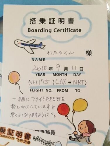 USA→東京への飛行機内でCAの方が食事の配膳も終わり、のんびりモードになられました。なので、 >> 絵葉書を1枚頂けないかしら? << と話しかけた。 そこからお話が弾み、 >> 重度喘息と自閉症を持つ息子が飛行機が大好きで、絵ハガキを頂ければ、一人暮らし…