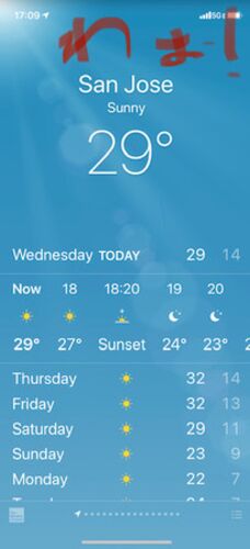 水曜日のカリフォルニア州サンノゼ市の夕方5時10分の気温です。 ないわー。夕方の5時こしてこの気温。日中はもちろん、もっと高かった。 渡は言語療法の日で、車で連れてきました。車の中で真剣な顔で私に 「ママ...」 と言うので、疲れたのか?気分が悪い…