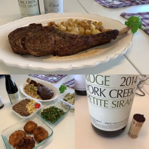 会社にいくとお昼が用意されていた。私もお弁当をもっていったので、すごい量に。 このステーキはトムホークスというステーキで、1.3kgあります。 それにころっけやポテトサラダ、オクラの和物、鶏そぼろ丼などなど。まるで体育会系の部活の合宿弁当のようだ…