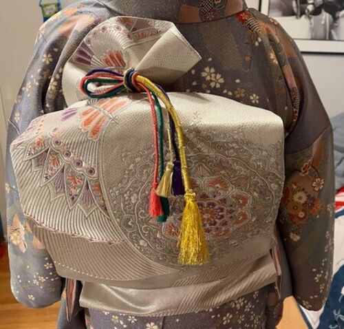 本日は新年会があったので、出席してきました。新年会といえば、お着物👘かなー、と思い。 ちょっと変わりむすびをしていただきました。おめでたい扇🪭で。 多くの方とお話しできて非常に楽しい時間を過ごせました。 後ろ姿はこんな感じでございます。 やっぱり…