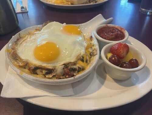 日本出張が長くなると、この朝ごはんを食べたくなることがよくある。 スケレット(Skillet)です。 鉄製のフライパンに、ベーコンを炒めて、じゃがいも、パプリカ、玉ねぎ、ハム、マッシュルームズッキーニ等々の野菜(店によって入る野菜は違う)を塩胡椒し…