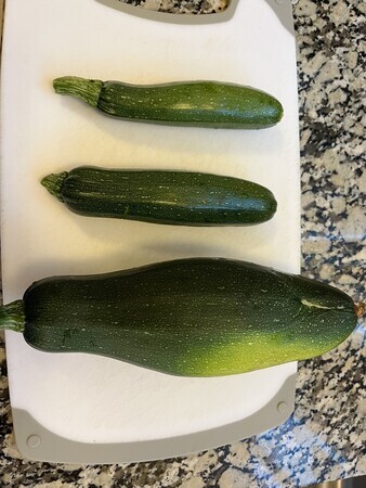 2024-06-13 庭のズッキーニの収穫 渡が毎日お水をあげて育てているズッキーニが元気です。 今日は収穫しましたが、葉っぱが大きくなりすぎて、葉の影で隠れるようにして、すくすくと成長していたのが1本。 大きいのは煮物にすると美味しいのよぉ。 これから8月までは、渡が作った庭の野菜が大量にできる日々だわ。楽しみぃ。